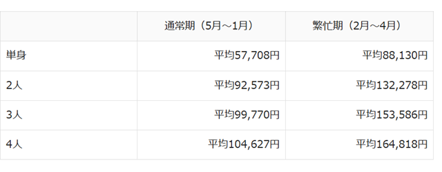 上記の表を見ると、通常期と繁盛期という条件だけでも